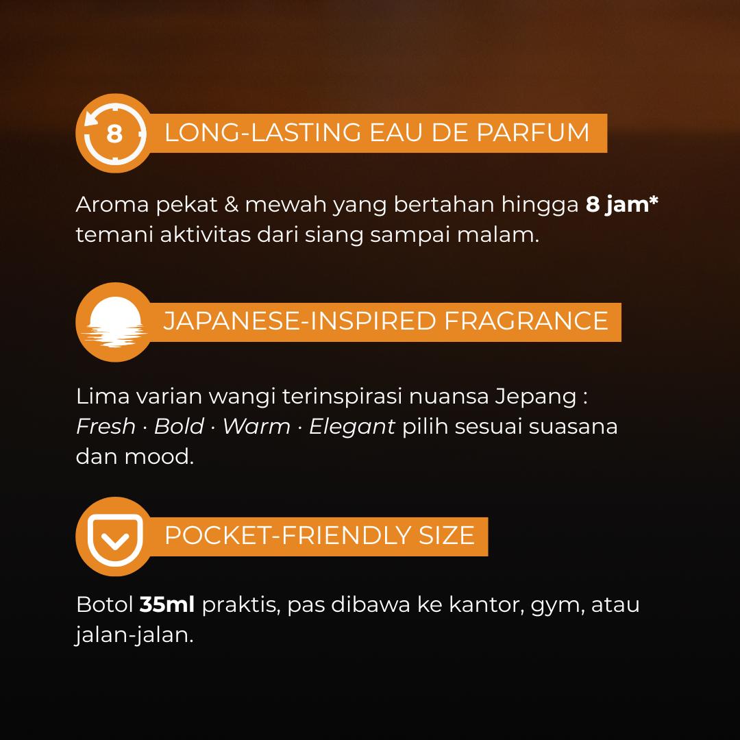 Dengan aroma mint, vanilla, dan woody, parfum ini memancarkan kesan bold, sensual, dan penuh percaya diri. Formulasi EDP membuatnya bertahan hingga 6-8 jam, ideal untuk malam hari ; first date, dinner, atau acara spesial.