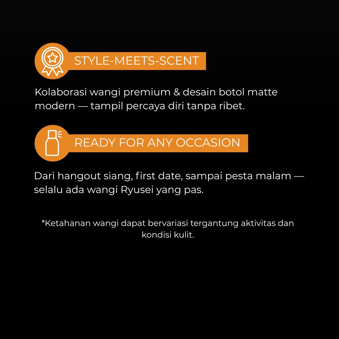 Ryusei Mist merupakan koleksi Eau de Parfum berukuran 35ml yang dirancang untuk memberikan kesegaran tahan lama dalam setiap semprotan. Hadir dengan lima pilihan aroma yang unik dan memikat, setiap varian Ryusei Mist merepresentasikan karakter berbeda yang dapat disesuaikan dengan suasana maupun kepribadian pemakainya. Dengan kemasan yang praktis dan desain elegan, Ryusei Mist menjadi pilihan ideal untuk penggunaan sehari-hari maupun momen spesial.